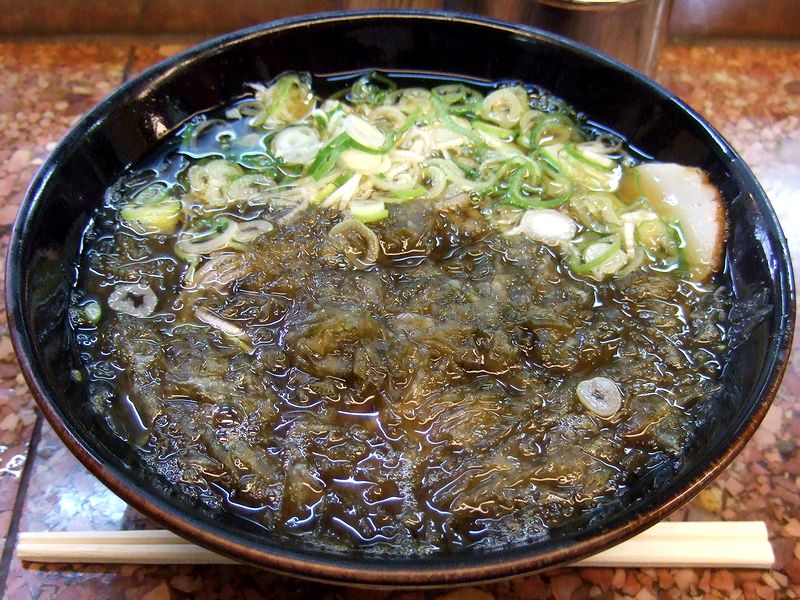 前の記事の串かつをいただいた後、何か〆に炭水化物的なものが欲しかったのですが、そんな時、通天閣近くを歩いていて発見したのがこちらのお店。それでお店の前の看板に書かれた『かすうどん』というものに興味を惹かれて入店したのですが、後で調べてみると、大阪府の南河内地域などで食されている食材に、『あぶらかす』もしくは単に『かす』と呼ばれる物があり、牛の小腸などを油を取る為に熱した残りで、当地ではまさしくソウルフードとして昔から様々な方法で食べられてきたとの事。近年は油を取った残りではなく、ホルモンを素揚げして作ったりする物もあるそうなんですが、それらがうどんに入った物は『かすうどん』と呼ばれ、近年、だんだんとメジャーになってきているらしいです。