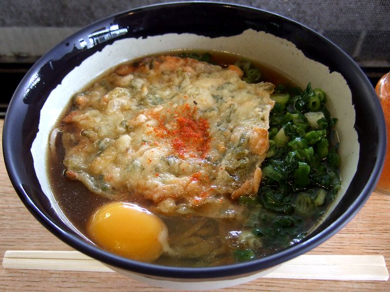 で、そのきしめん。つゆは、名古屋らしい醤油の効いた物ですが、自家製というかえしは甘味が丁度良く、店ごとに取るというだしの感じも自然です。個人的にはあとほんの少しだけ塩気が欲しい気もしましたが、とっても美味しいつゆなんじゃないでしょうか。そしてきしめんは冷凍物ですが、何でも特注品だそうで、ツルツル感、ピロピロ感がとても良いですね。そして具のかき揚げは揚げたてで香ばしく、海老も結構入ってリッチな感じだし、つゆとの馴染みも良いです。それと玉子は半熟玉子なんですね。
