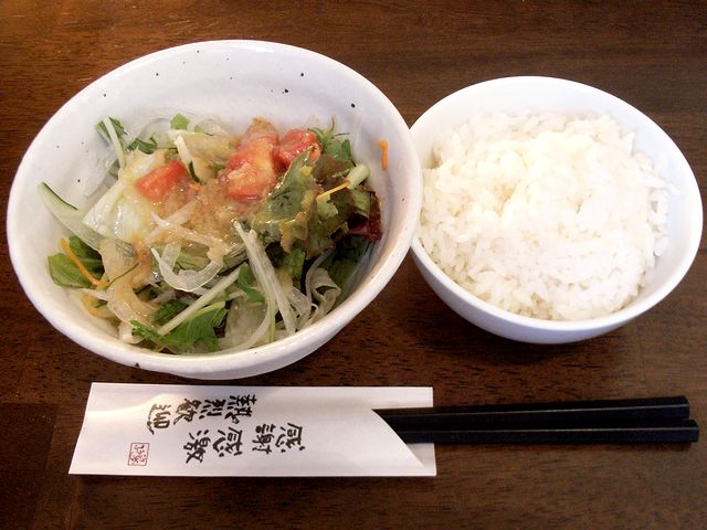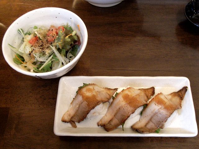スープは、前回『深<しん>』をいただいた時にも感じた、熟成感のある複雑な味わいの味噌をベースに、節度ある抑えられた辛味が加わって、後味は軽い感じというか。これもまた美味しいスープですね。手もみ太麺と手もみ細麺から選べる麺は、今回も太麺をチョイス。もうすっかりお馴染みとなった全粒粉麺で、モチっとした食感です。具のチャーシューや半熟の味玉、メンマも相変わらずいい感じで、最後は、セットのライスをスープに投入して、最後の一滴まで美味しいスープを堪能させていただきました。あと、一緒にいただいた蒸し餃子はとってもジューシーだし、セットのサラダいつもはキンっと冷えてて相変わらず美味しいです。
