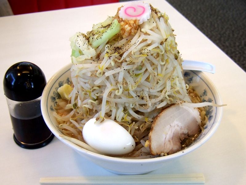 そして、待つこと暫しで登場したごじ麺なんですが、丼の中央上部からは、黒コショウがかかっている野菜(ほとんどがモヤシ)が塔のようにそそり立ってます。作る時、野菜が入った(というか詰まった)テボざるが2つ用意されていたのですが、それが全て載ってしまったのでしょうか。とりあえず、「薄まった時に使ってください」と一緒に登場したタレを野菜にかけつつ、こぼさないようについばんで麺を引っ張り出すスペースを作成。ちなみにタレは、甘みが効いてて美味しいですね。で、野菜と格闘する事暫しである程度スペースが出来たので、今度は麺とスープをいただくのですが、極太の縮れ麺は登場してからたどり着くまで暫くかかってしまったにもかかわらず、ホギホギした堅めの食感をキープ。ツルツルっ口に入るわけはなく、ワシワシと噛みしだいていただくのですが、個人的好みとは違けどこれはこれで美味しいかも。またスープは、表面に大粒の背脂がプカプカと浮いているのですが、味はそれほどワイルドに感じず、むしろ、どちらかというとスムースな感じの豚骨スープ。ただ、さすがにこれほどの量の茹で野菜が入ると、ちょっと薄まった感が出てしまうのは仕方のないところなのですが、前述のタレと相まって結構旨く、更には、あらかじめ降られた黒コショウや頭頂部に載っているタレに漬け込まれた刻みニンニク(辛味は強いです)とも良く合っています。それとチャーシューは、歯応えがある若干厚めの@というかΩ型で、味加減は丁度良く。あと、茹で卵が半個分載っていました。