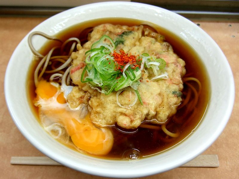 と、前置きがながくなりましたが、その天玉そば。関東らしく黒っぽいつゆは、塩気がキチンと感じられますが甘味がそれほど効いておらず、昔ながらの味という印象。また、温度がやや熱めなのが良いですね。また蕎麦は、白っぽく太めで、ソフトな食感からすると茹で麺でしょうか?そしてかき揚げは、モソっというかミシっという食感で、つゆに溶けるような感じではありませんが、中にはゲソや小海老などの具がビッシリと入っていて、食べ応えがありました。