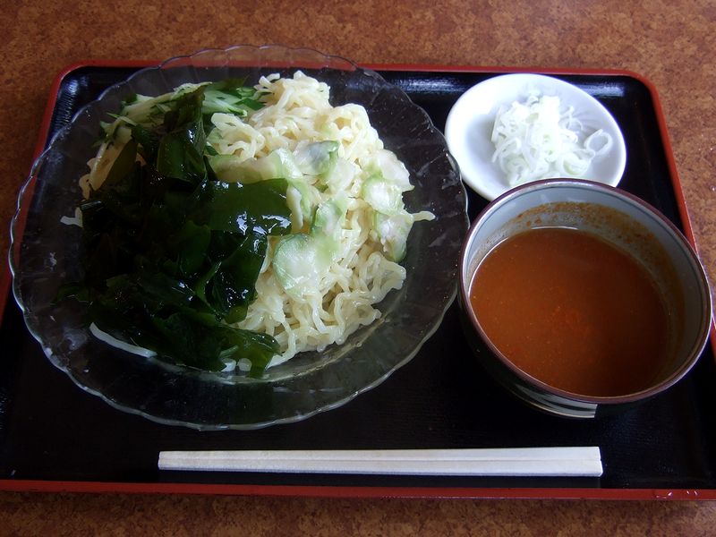 というわけで冷しつけめんなんですが、つけ汁は唐辛子が効いた味噌味で、潔い唐辛子の辛さと香りが良いですね。麺は、こちらのラーメン類共通の物のようですが、締められたことでコシと喉越しが良くなっていて、ツルツルっといくらでも入っていきそうです。また、麺の上載ったザーサイは良い箸休めになり、キュウリとたっぷりのワカメは何とも夏らしい感じをプラスしてくれているような。