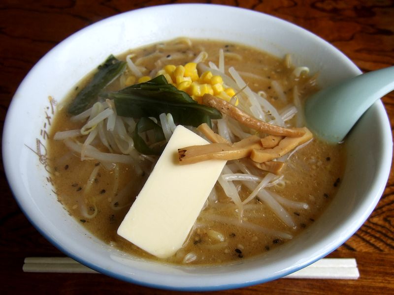 そこでいただいたのは、みそバターラーメン。実は、味噌バターラーメンを初めていただいたのって、今は亡き矢板の「どさんこ」(確か、国道4号線沿いで東北本線との間にあったお店)だった記憶があり、当時その美味しさに衝撃を受け、その後、自宅でいただくインスタントラーメンやらカップ麺に、やたらとバター(実際はマーガリンが多かったのですが)を入れまくっていました。と、話が逸れましたが、そのみそバターラーメンは、何とも懐かしい味。ベースのスープは昔っぽくあっさりとしていると思うのですが、そこにニンニクがかなり強めに効いた味噌ダレが加わり、さらに、上に載ったバターの風味とまろやかさが加わると、何とも安心できる旨さというか。そしてそのスープと共に、あまり加水感のない麺を啜れば、昔いただいた時の記憶が甦るような気がします。また具は、モヤシにコーン、挽肉にメンマ。やっぱり、懐かしい感じのする味噌ラーメンには、チャーシューは不要かと。それと、茎ワカメが入っているのが珍しいですね。