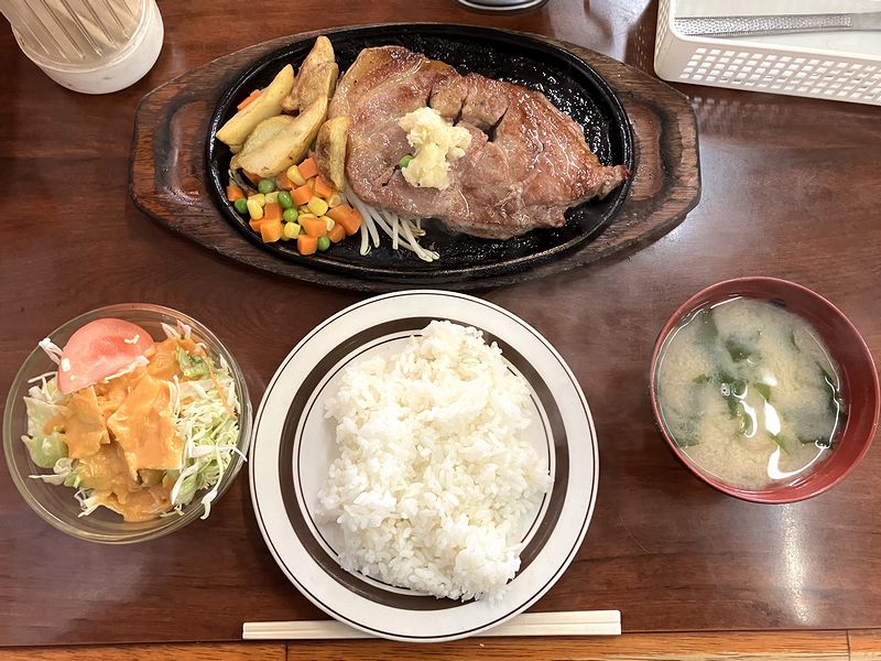 注文から少し待って登場した、そのにんにく焼き。写真の撮り方が下手でよく伝わっていませんが、アツアツの鉄板に載った豚肉は、かなりの大きさ、そして厚み。そしてその上に、生のおろしニンニクが載っています。ちなみにしょうが焼は、このニンニクに替わって生のおろしショウガとなっているのは、前回訪問時、他のお客さんが食べていたのを見て知っていたところ。そこに、ソースポットに入ったタレを回しかけ、いざ。
