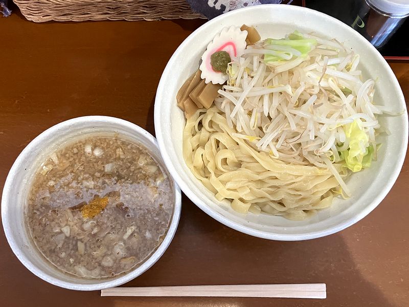 そして具は、つけ汁に入った角切りチャーシューは、つけ汁をたっぷり吸って結構しょっぱみがあの鱒が、逆にこれが良いアクセントというか、麺や、今回追加した茹で野菜と一緒に口に入れると、何とも良い感じ。一方、麺に載っているメンマは、食感、味共に優しい感じ。追加した温野菜は、背脂のコッテリ感に適度なサッパリ感をプラスして、更には味濃い目のつけ汁と絶妙のコントラスト。