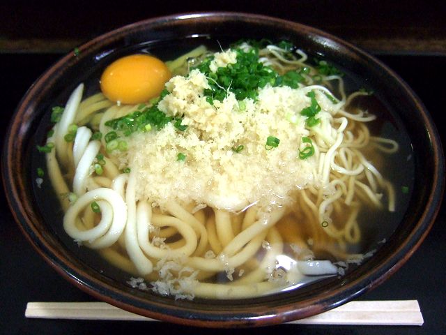というわけで、丼に入れられて手渡された麺をテボ(取っ手付きの深いザル)に入れて暖め(この時、同じテボに入れても不思議な事にうどんとラーメンは混ざらないんですね。)、横にある暖かいつゆを掛け、その近くにある薬味類(ネギとショウガ、そして天かす)を入れ、生卵を割り入れれば準備完了。店内に8席しかない椅子席が丁度空いたところだったので、そこに座っていただきました。
