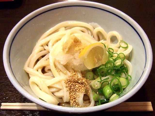 で、こういう事をすると大抵は後悔したりするのですが、こちらのお店はそんな事ありませんでした。適度に締められたうどんは、ツルツルのシコシコ。だし醤油もいい塩梅で、大根や生姜のおろした物、香ばしいゴマやネギと共に、アッサリ美味しくいただけました。また、レモンは退けておいて途中から搾ってみたのですが、以外と合うものなんですね。