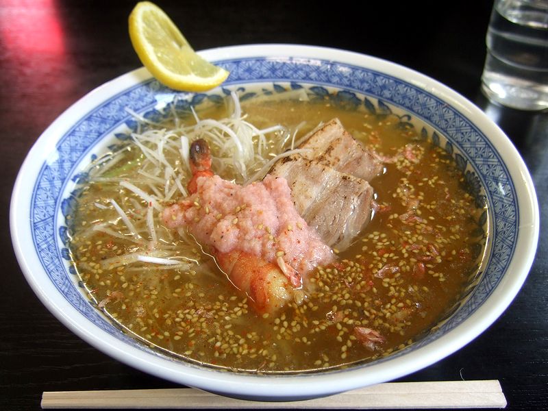 でもその海老そばが、かなりの美味だったというか。ベースは、こちらのアッサリとしたスープに硬質な食感の縮れ麺だと思うのですが、そこに加わる、油と共にスープに浮く桜エビや、きれいなピンク色のエビだれなど、色々な海老の味や香りが、何とも。またそれが、相変わらずの絶品チャーシューや天盛りにされた白髪ネギとも良くマッチしてるし、後半から投入するレモンで味の変化も楽しめるし。それと、二種類の味噌+お酢でいただくギョーザも、前回同様とっても美味しく、今回は一緒に頼んだ小ライスが進みまくりでした。