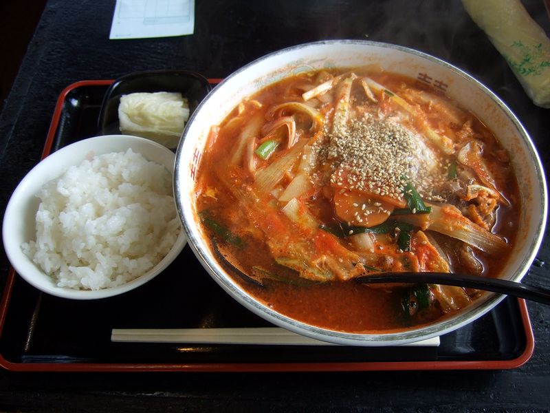 で、今回は、前回いただいてとても美味しかった味噌チゲらーめんではなく、こちらの基本とおぼしき味噌らーめんを、ランチセットの餃子ライスと共に。こちらの店主さんの修業先が味噌ラーメンで有名な満天家さんなので、是非一度こちらでも味噌ラーメンをいただいてみたかったんですよね。