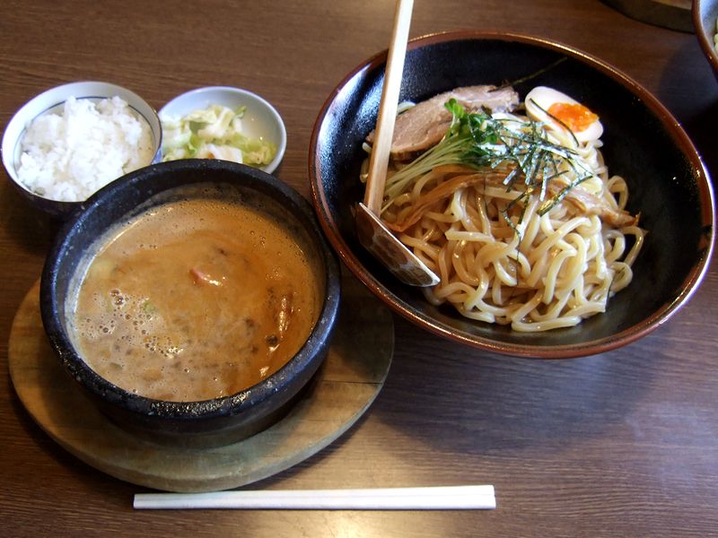 注文、というか食券を渡して暫くすると、まずは付け汁から登場。立ち上る海老の香りが凄いのですが、なんと付け汁の中には海老の頭が!それにしてもこの香り、食欲をそそります。なので早速、ぶっとい歯応えのある麺を浸けていただくと、脂やエキス分が溶け込んだコッテリした口当たりからして、こちらの濃厚系の付け汁がベースになっていると思うのですが、海老の風味と旨味によって更にグレードアップしているような。そして、麺を食べ尽くした後は、オススメに従って半ライスを投入すれば、確かに旨いですね。で、半ライス投入時に付け汁はあえて薄めなかったんですが、個人的にはちょうど良い濃さでした。