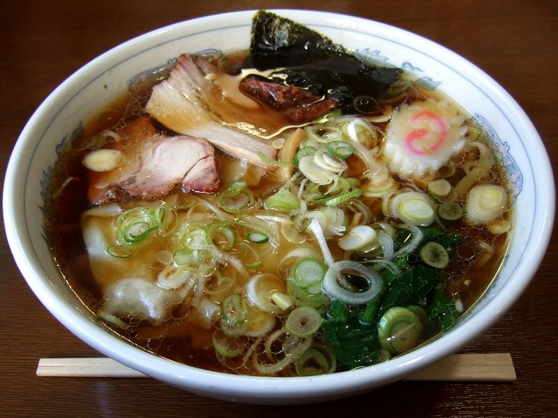 それでいただいたのは、個人的に白河ラーメンのお店に初めてお伺いした際いただくことが多いこちらをば。で、まずはスープですが、白河っぽくというか、見た目どおり醤油風味が強く感じるのですが、負けずにガラのダシも効いていて、その風味も結構きますね。それに、表面に浮く多めの鶏油と相まって結構ワイルドな印象を受けましたが、パンチがあって実に良いですね。そして手打ちされる麺は、太さが不揃いに切られ、その食感のバラエティーが良いです。また具のワンタンは、白河ラーメンではあまり記憶にないやや厚めの皮にしっかりとした餡が入った物で、食べ応えがあるそれが5つも入っていました。それとチャーシューは(調理中の音だけ聞く限りはバーナーで?)しっかりと暖められ、肉の味が堪能できました。
