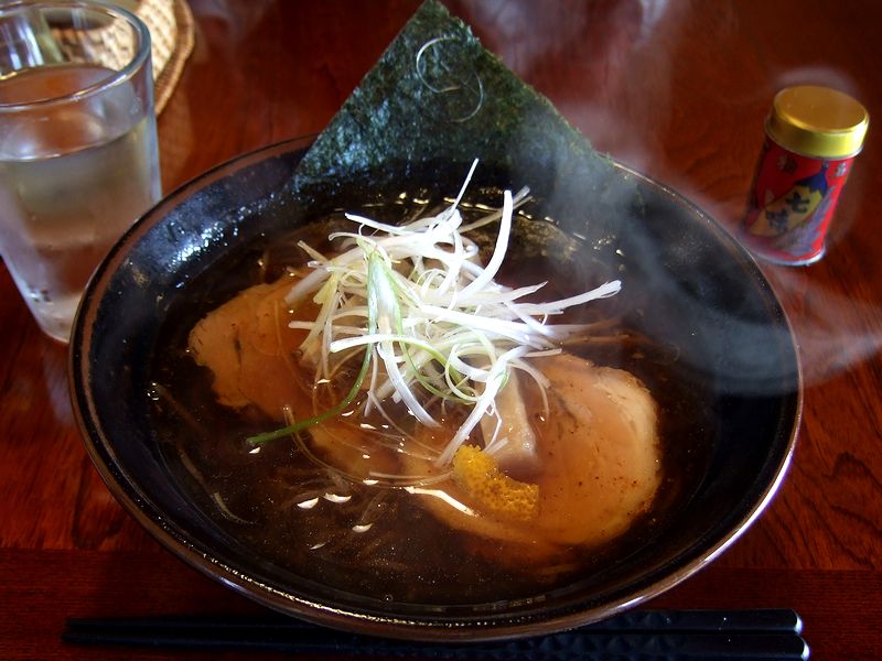 初めていただくそば殻麺ですが、ラーメンのような蕎麦のような何とも不思議な風味と食感があって、とても美味しい麺ですね。それが入るスープは、ベースが清湯なのですが、表面に浮く油が結構あるので、割りとコッテリした口当たりに感じました。それでその油と、醤油と若干の甘みを感じる味付けが、そば殻麺と良く合っているんじゃないでしょうか。それに、白ネギと柚子の香りもとても良く合っていて、添えられた七味を振ると、これがまた美味。メンマやチャーシューも素晴らしく、何ていうか、申しぶんないですねぇ。