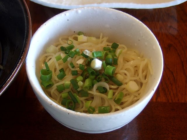 そんなわけで、そば殻麺を堪能した後は、替玉を追加注文。替玉が小振りの丼に入って登場し、上には青ネギが載り、器の底にはタレが入っていました。それを丼に投入していただけば、こちらの麺も、また美味しいですね。細いけど歯応えはしっかりあって、それでいてきちんと麺に火が通っている感じがして。