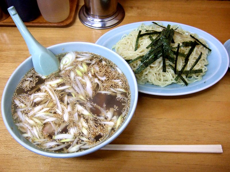 というわけで、そのつけめんなんですが、麺は、こちらのラーメンと共通の物でしょうか?ただ、水で締められているので、当然ながらラーメンより歯応えに弾力が感じられます。そして付け汁ですが、甘みや酸味、そして辛みは無く、塩加減もそのまま飲めるくらいの濃さ。ですが、表面に大量に浮かぶゴマと白ネギ、そして麺の上に載る海苔の風味が、麺を美味しく食べさせてくれます。何ていうか、これ、いいですねぇ。食べ進むにつれ、「この麺には、この付け汁!」と思えてきました。また、付け汁の中には、こちらの絶品チャーシューと、これまた美味しいメンマが入っていて、それと一緒に麺をいただけば、これがまた。そして、卓上のラー油やお酢を投入しても美味しかったのですが、特にラー油は、その良い香りがとてもマッチしている気がしました。