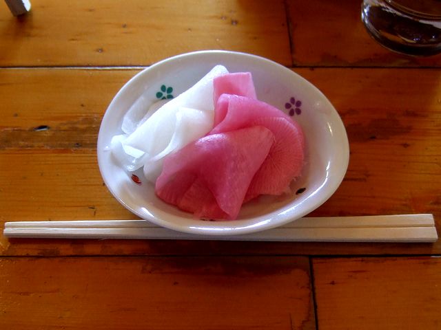 まずはラーメンを待つ間に出された大根の漬け物ですが、昨年の正月同様紅白仕様になっていました。