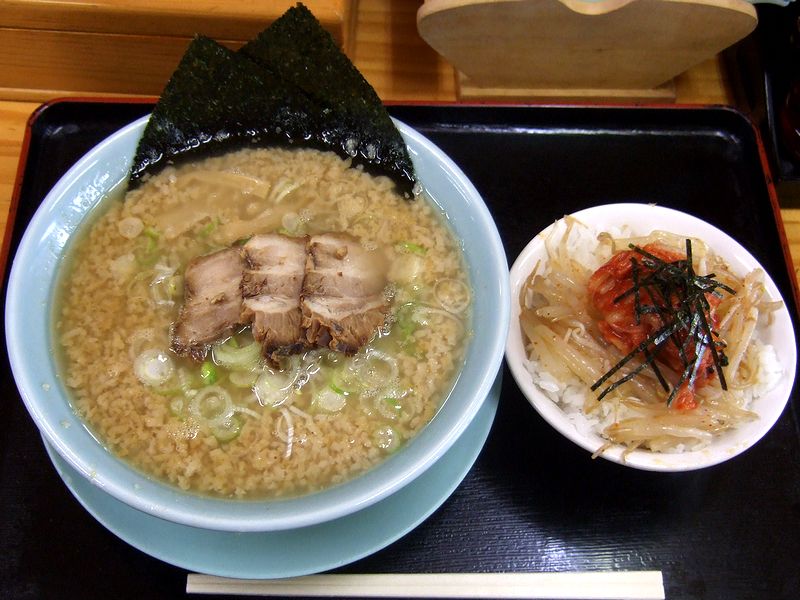で、まずはこってり系ラーメン。ビジュアル的には記憶にあるまんまで、スープ表面には背脂がこれでもか、と。そしてレンゲでスープを一口啜ると、「あれ?こんなに鰹節の香り強かったっけ?」というわけで、背脂のコクと脂感に、華やかな節系の香りが絶妙にマッチして、記憶にある味より更に美味しくなっている気が。(まあ、私の記憶なんて元々アテにならないんですがね…。)また、手もみされて縮れのついた中太麺もモチモチだし、柔らかいチャーシューは相変わらず美味。あと、個人的には、こってり系には途中からニンニクを投入するのがお約束なのですが、今回は前述のとおり節系の香りが強く感じた為か、投入すると、美味しいのですがちょっと勿体ない感が出てしまったような気がしました。それと、一緒にいただいた辛々丼は、御飯の上に唐辛子等で味付けしたモヤシとキムチが載った一品。ラーメンを一口いただいた後だと、キムチの強い味がラーメンの鰹節の香りを消してしまうようで少々勿体ないかな、なんて思ったのですが、細かいこと考えずにワシワシいただくと思いのほかマッチして旨かったです。(特に、ラーメンにニンニク投入後は良く合っていたように思いました。)そして最後は2口程度残して、そこにラーメンの汁を掛けていただいてみると、これがまた。