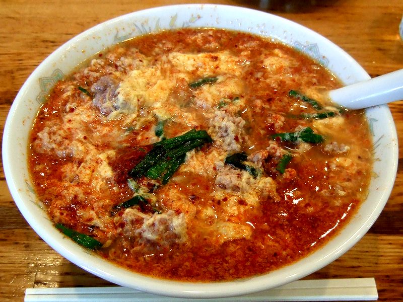 で、そのラーメン本にも書いてあるとおり、こちらのタンタンめんは、日本で一般的に「担々麺」と言われる物とは全く別物。かといって中国のオリジナルに近い物でもなく、お品書きにも書いてあるとおり、塩味で、唐辛子、挽肉、ニラ、溶き卵を使った、こちらのお店独自のメニューになっています。ちなみに辛みは調整可能のよう。他のテーブルでは、注文の際、辛さ控えめでオーダーしていた方が何人かいらっしゃいました。して、そのお味の方ですが、唐辛子のパンチが効いた(個人的には丁度いい)辛さのスープと、ふわふわの卵が絡むシコッとした麺が、何とも美味しいですね。また、今回はタンタンめんのみでいただきましたが、残った汁にライスを投入してもイケそうです。