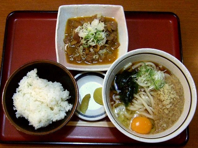 と、話が逸れましたが、個人的には、山田うどんと言えば『パンチ』。何故もつ煮のことをパンチと言うのか判らないし、メンマが入ったもつ煮というのも珍しいと思うのですが、とにかくこの時は、旅の初っ端にガッツリと栄養補給したくて、ゆえにパンチを食べないと気が済まないという感じだったので、そのパンチと白米、そしてたぬきうどんが付いた『パンチセット』に、生玉子を追加していただきました。