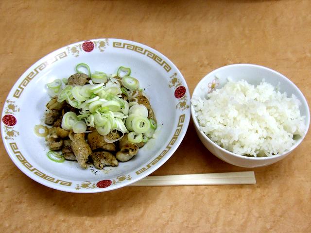 で、こちらのお店は『青ねぎラーメン』が有名で、テレビ番組でも取り上げられたとか。お品書きを見るとそれ以外にもいろいろとあるのですが、結局のところ自分は名物の青ねぎラーメンともつ焼と半ライス、同行者はノーマルなラーメンという組み合わせでお願い。注文してからはそれほど待たずに、まずはもつ焼と半ライス、そしてほどなくしてラーメン2品の順で登場しました。