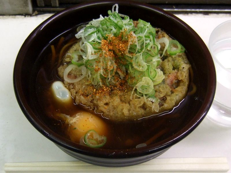 で、実はこの日、大阪で2杯ほど(その1、その2)立ち食いうどんをいただいてきたのですが、こちらのそばをいただいた途端、「帰ってきたなぁ~」という感じに。確かに、大阪のうどんも美味しかったのですが、この、醤油の効いたつゆをいただくと、本当に帰って来たんだな、と。そのつゆは甘味やや控えめな味が好みドストライクで、しかも熱々なところがまた。そして、ソフトな食感の麺や粉っぽさが無いかき揚げもいい感じだし、途中から卵を絡めれば、もう…。乗り換えの関係で、つい早食いになってしうのが勿体ないくらいの旨さでございます。