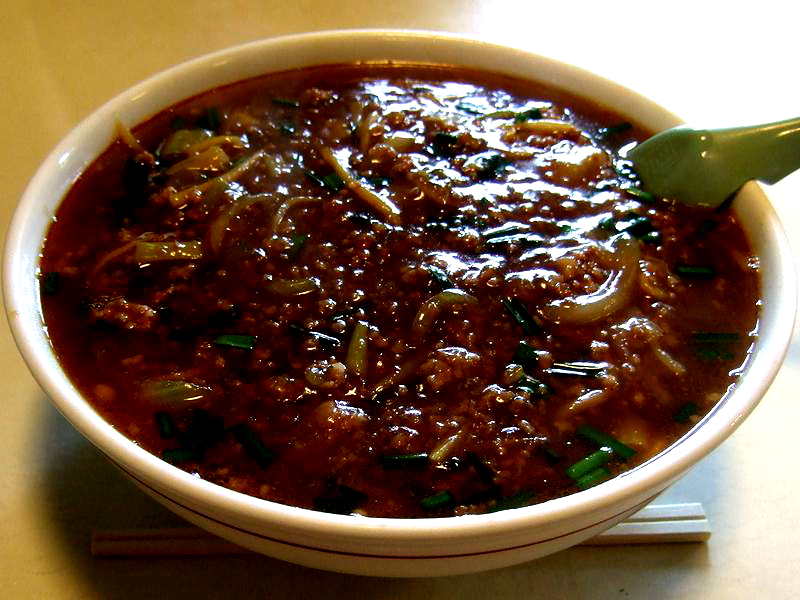 また、同行者はマーラーめんというのをいただいていましたが、こちらも、かなり凶悪なメニューのよう。表面にはcm単位で挽肉と油と味噌の混合物が層になっていて、お味の方は阿Qさんお得意の甘みの効いたコッテリ濃い味で。