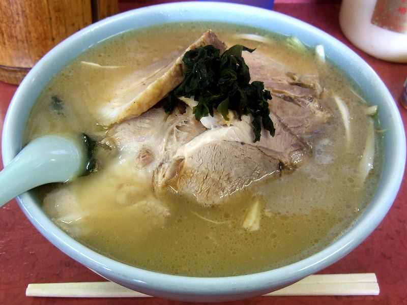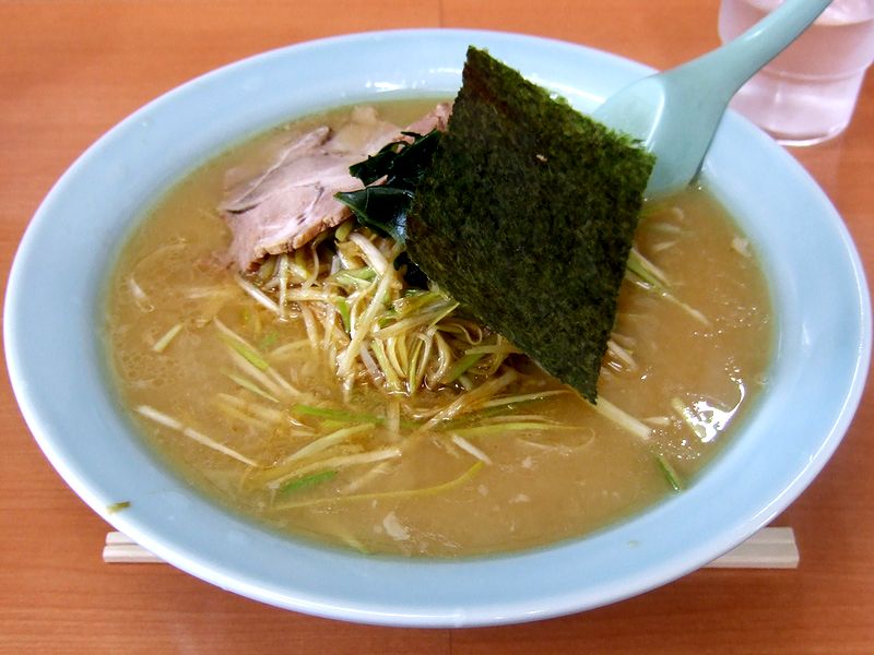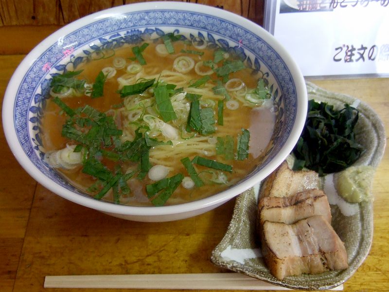 で、まずはネギラーメン。背脂など追加されていないスープは、コッテリ感は控えめでわりとライトな口当たり。ただし、豚の十分な旨味とコクは感じられます。少ない経験から申せば、これまでいただいたことのある県内のラーメンショップの中ではあっさり目なほうかと。そこに、ネギを和えたゴマ油の香りが加わると、もう。そのネギは、わりと細かく刻まれ、麺に自然と絡んで口に入ってきます。そして麺は、ラーメンショップの麺。ゆで加減は若干固めに感じましたが、これは好みもありますので。あとネギ以外の具は、薄切りのチャーシューとワカメ。チャーシューは、柔らかくも歯応えのあるラーメンショップっぽい物ですが、結構いけてました。