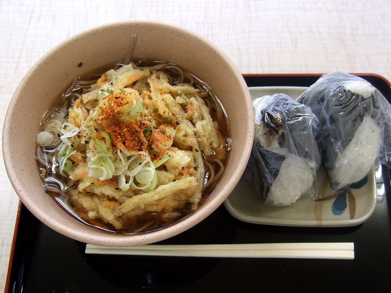 その、かき揚そばセット。とりあえず、そばからいただきました。つゆは、昆布?っぽいダシの香りを強く感じました。また塩気は、個人的には微妙に薄く感じましたが、卓上に醤油があったので投入したところ、丁度良い感じに。ただ、私自身、何にでも醤油をかけると言われる栃木の人ですが、とうとうこのようなそばにまでかけてしまったことに、後になって考えると少々後悔というか、「もう戻れないんだよ…」という感じに…。麺は、生か冷凍かは確認できませんでした(食券を購入した時点で茹でに入っているので)茹で時間からして冷凍でしょうか?ただ、そのわりには、冷凍麺にありがちな変な歯応えが無くて、個人的には好きな食感でしたが。かきあげは、野菜中心。その野菜は結構大きく切られてます。それと、おにぎりは、栃木県産こしひかり使用ということで、不味い訳はありません。(実際いただいても、旨かったですよ。)ちなみに、具は梅干しと昆布でした。