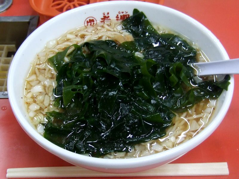 それでまずは湯麺。見た目は、丼一面に載せられたワカメが目に付きますが、その下には済んだスープに浮かぶ刻みタマネギとメンマが。とりあえずスープを一口いただくと、ワカメの風味が強く感じられ、そしてお酢の酸味が。また、スープのダシは豚骨と乾物系とのことですが、あくまでも裏方というか、陰からじわじわと効く感じで、何ていうか、お酢の効いたワカメスープといった感じというか(思わず、炒りゴマでも振りたくなってしまいました。)、ワカメが入ると結構違うものになるんですねぇ。また麺は、別のお店でいただいた時と同じく冷や麦のような味と食感ですが、その時と比べると若干太いような気が。また、茹で時間はわりと長く感じたのですが、最初は割と歯応えを感じ、その後は割と早めに食感が柔らかめに変化するように感じました。そして具は、前述のとおり大量のワカメと、みじん切りのタマネギ、そしてメンマ。とにかくワカメが多いのですが、戻し方が上手いのか歯応え、風味とも良かったです、それと、生タマネギは湯麺に欠かせないというか、この味と香りが、うまく働いてますね。それと途中からは、店のオバチャンにも言われたとおりラー油を投入すると、これがまた。もっとも、更にワカメスープ度が上がる気がしましたが。