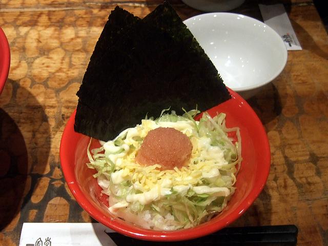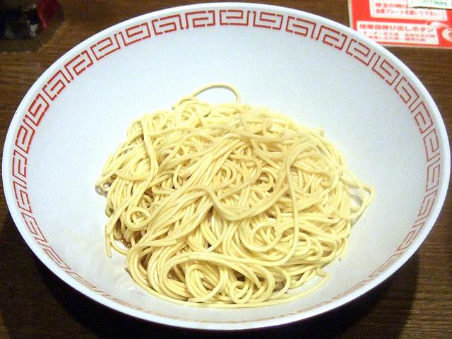 つぎに、同行者がメインですが、私も結構な量をへずってしまった白丸元味。最初にいただいた時、割と豚独特の風味を感じたのには少し驚きました。ただ、豚の嫌な部分は当然感じられず、上手に独特の風味を生かして、豚骨ラーメンらしい味を作っているように感じました。また麺は、博多らしい極細麺。ゆで加減は普通で頼みましたが、噛み切る時ボソッと切れる感じではなく、プチッとした噛み応えが。それと、いただいていると、香油でしょうか?ちょっと香ばしい風味が微妙に漂う感じがします。なんていうか、ベーシックですがとても洗練された豚骨ラーメンという感じですね。