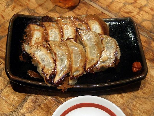 そして、サイドメニューの明太子ごはんとひとくち餃子。明太子ごはんは、明太子自体に何か一手間加えてあるのか、お酒の様な風味を感じられました。また、結構マヨネーズが効いているのですが、具のレタスの食感と、先述の明太子の風味が絡み合って、ただの明太子ごはんではありませんね。餃子は、薄い皮がパリパリして、中の餡はジューシー。名前どおり一口サイズなので、パクッといただくとその両方の食感が一気に楽しめます。これはビールが進みますねぇ。そして、お皿の端に添えられた柚胡椒を付けるとまた違った味わいがして面白いです。