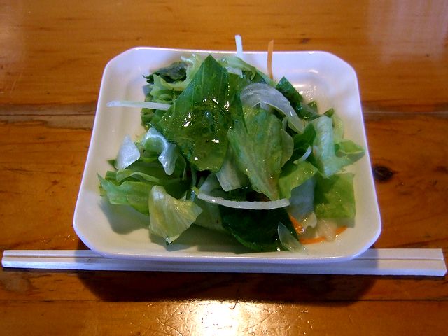 まずは注文してすぐ、サービスで出される突き出しが、このところ続いていた大根の甘酢漬けからグリーンサラダに替わっていました。で、早速つまんでみたところ、ひんやり爽やかで、何気にレタスが旨いです。また、卓上の黒コショウがとても合いますね。