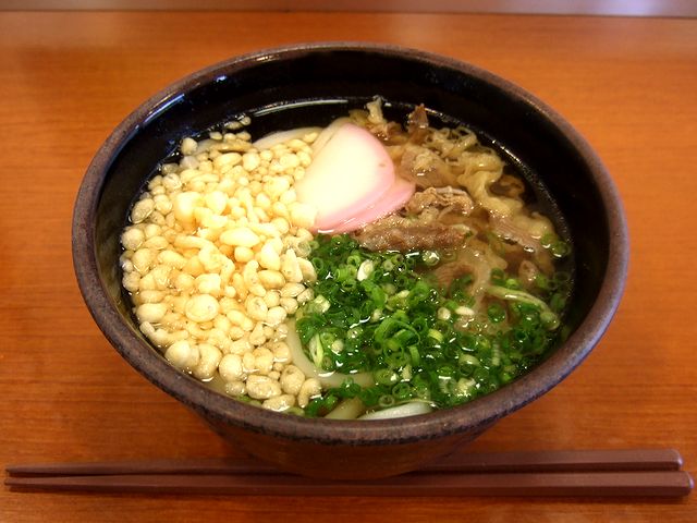 と、いうわけで、その肉うどん。つゆは当然ながら関西風、というか九州・四国を除く西日本風で、結構だし(アレルギー表記を見るかぎり、鯖節が使われている模様。)が効いていて、塩気も充分。それと甘辛い牛肉の組み合わせは、個人的にはこれまた、関西、というか九州・四国を除く西日本を感じる味で、けっこう満足。また、揚げ玉が、好みの量を自由に入れられるというのも良かったです。