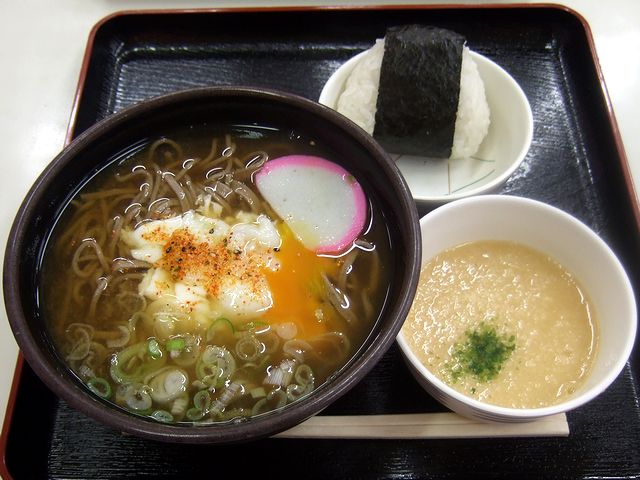 とろろそば 560円 +クリーンエッグ(温玉風) 60円 + おにぎり1個 150円