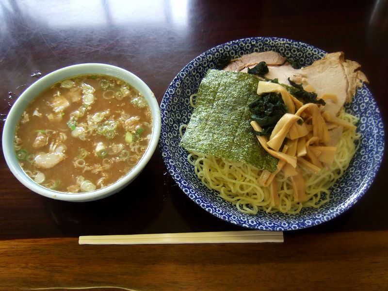まずは一口、麺を付け汁に浸けていただけば、その味は、ガラ系+節系+醤油+甘味+酸味(+旨味)の、いわゆる東池袋大勝軒系だとわかるような味なのですが、タレというかその味付けは、醤油の塩気が強く、甘味は適度にそして酸味はごく控えめに、トータルではかなり濃いめの味付けに感じられました。これだけ付け汁の味が濃いと、普通盛りで300gある太めの麺を、一気に食べてしまいますね。その麺は、固めの食感というかソリッド感のあるもので、気のせいかもしれませんが、今までいただいた東池袋大勝軒系のお店で感じることの多いプリプリ・サクサク感のある麺とはちょっと違う感じも。もっとも、これはこちらのお店の『個性』だと思いますが。具は、サイコロ状に切られたサクサクした食感のチャーシューと、塩気がハッキリと効かされたメンマなどが付け汁の中に。そして、最後はスープ割をお願い。もともとの付け汁が濃く、それを減らさずにそのままお願いしてしまった為、結構たっぷりとスープを注いでくれたにもかかわらず、かなり濃いめの味に。お願いする前に、付け汁の一部を、麺の入っていた容器にあけておくんだったなぁ。