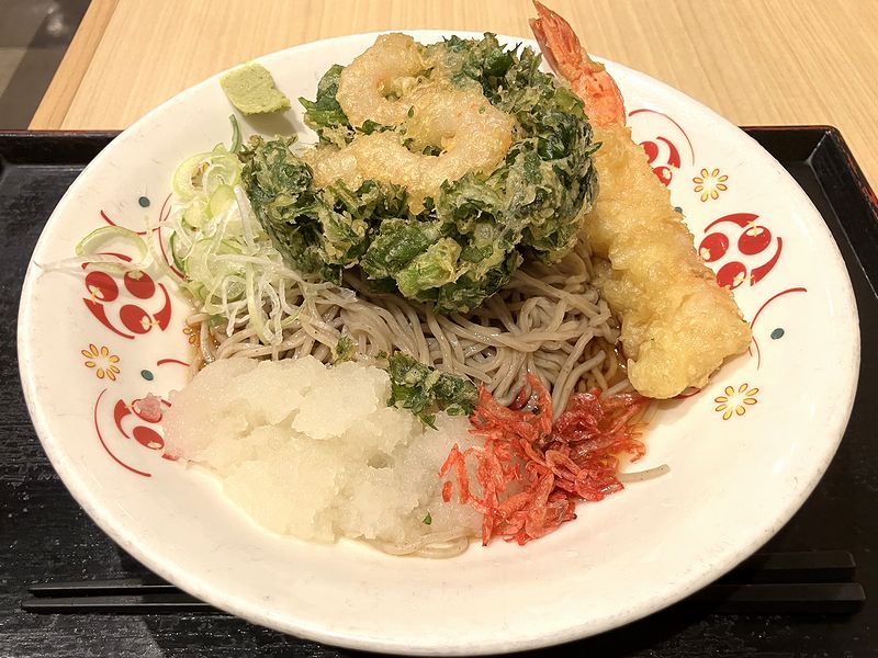 この日は12月にしては暖かい気温だったので、私は冷しえび天ぷらそばを大盛りで。