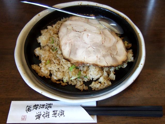 お願いして、待つこと暫しで、まず鶏めしが登場。熱々の鉄の器の上には、焼き飯と鶏チャーシューが載っていますが、店員さんの説明によると、その間に卵が入っているとのこと。とりあえず混ぜていただけば良いらしいので、チャーシューの上からスプーンでつつくと、じわっと卵黄が溢れ出しました。で、混ぜるのもそこそこにしていただいてみると、香ばしいご飯と鶏チャーシューに、この卵黄が絶妙に絡んで、何とも美味しいですなぁ。というわけでこの鶏めし、徹底的に混ぜて卵黄に完全に火を通してしまうより、所々生くらいのほうが、卵黄のコクをより感じられて美味しくいただける気がします。