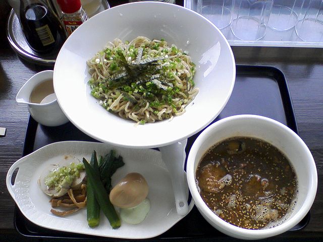 で、その旧バージョンのつけ麺ですが、見た目は今年の春に提供されていたバージョンと同じく、付け汁の器に、麺の盛られた皿、それに、具の盛られたお皿という構成。付け汁は、花の季のトンコツ醤油味がベースになっているとは思うのですが、生のタマネギのみじん切りと小エビ(ちっちゃい桜エビ?)が加えられていました。そこに浸けていただく麺は、シコシコのツルツル。具は、チャーシューとメンマはラーメンと同じ物だと思いますが、色々な夏野菜が揚げ煮(ナス)、甘酢漬け(新タマネギ)、お浸し?(青菜)など様々な調理方で調理されていて、とってもバラエティー豊かというか、とても楽しいです。そして最後は、スープ割りを堪能しフィニッシュ。