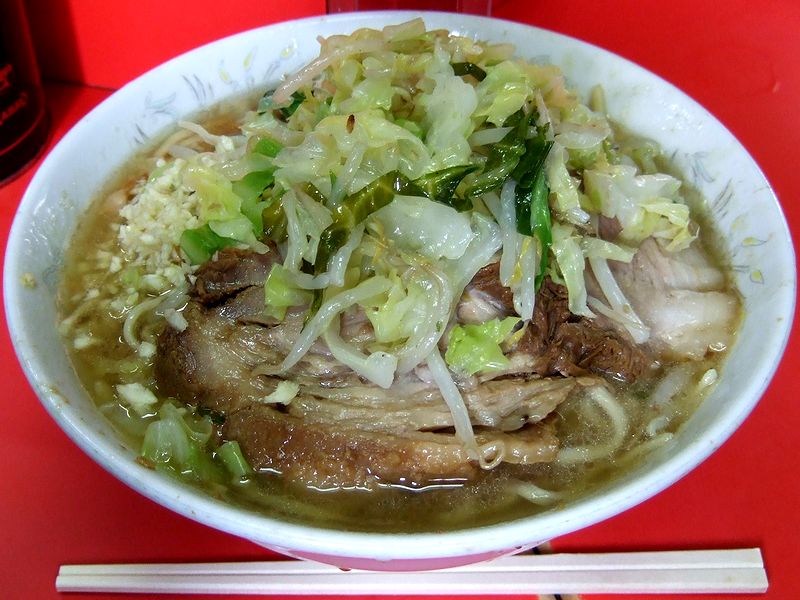京浜東北線を田町で降り、お店に到着したのは午前10時頃。この時間でも店外で数人の待ち客が。その最後尾に並び、順番となったのでラーメンの食券を買い、席が空くと助手さんに案内されカウンターに。食券をカウンターの上に出し、出されたお冷やを上から降ろし、しばしの待ち。厨房では、店主さんが黙々と麺を茹でておられます。やがて麺が茹であがり助手さんからトッピングを聞かれたので、「ニンニク」とだけお願いすると、とうとう、念願の三田本店のラーメンが、店主さんから手渡されました。