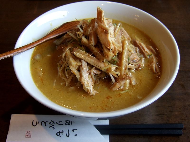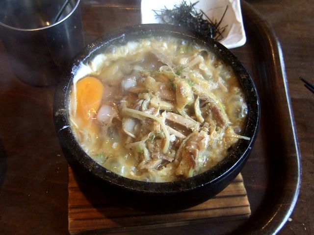 で、辛み味噌そばですが、やっぱりこちらの味噌系メニューは外れがないというか、美味しいですね。(もっとも、こちらのメニューはどれも外れがないと思っていますが。)スープはまろやかかつコクがあり、いつもの美味しい麺の上にはラー油?の辛みが効いた鶏肉もたくさん載っていて、満足感も充分です。そして、麺を食べ尽くした後はスープと残った具を噴火めしの上に。鶏肉が結構残っていたこともあり、噴火飯が(具だくさんになりすぎて)ちょっとすごいことになってしまいました。これなら、シンプルに昆布めしをぶち込んでいただいても良かったかも、なんて思いましたが、美味しいからいいや。