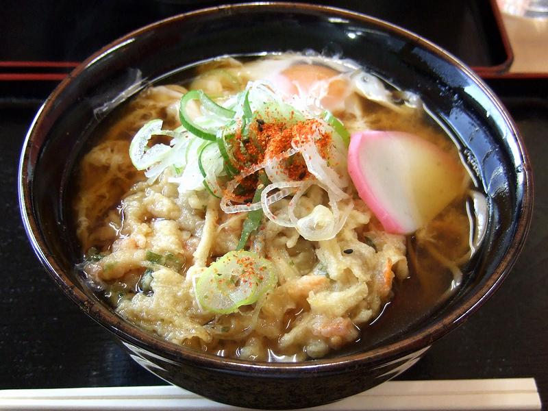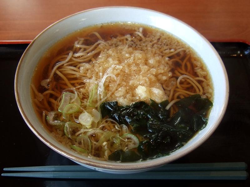 で、その花そば。登場したのを見ると、ワカメが入ったたぬきそばでした。早速いただいてみたところ、とっても熱々のつゆは、塩気も丁度良く、また、甘みがちょっと効いてて美味。それに揚げ玉のコクが加わって、なんともいい感じになっています。また、熱々のつゆに浸かっていても、麺はコシがありました。