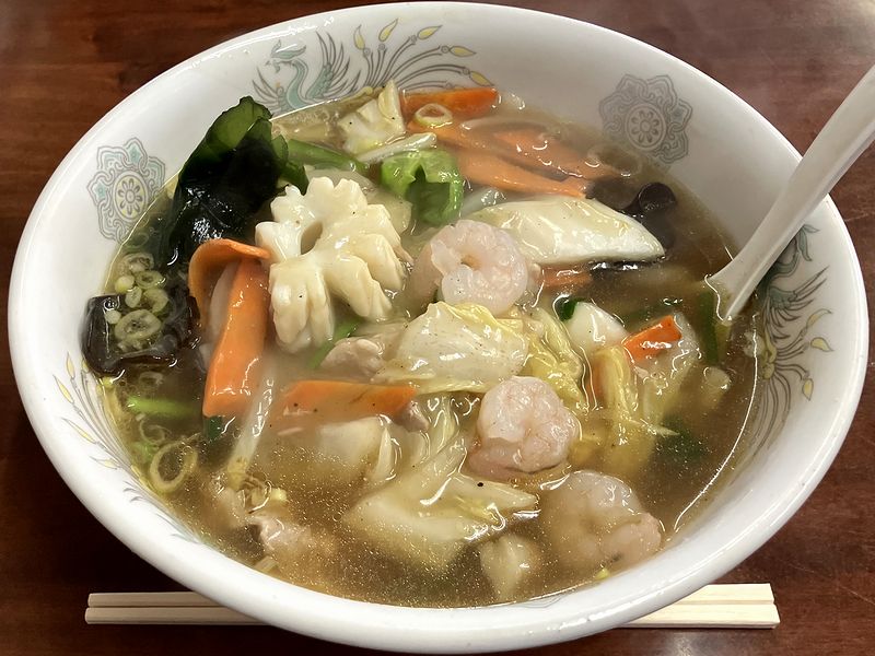 そして餡掛けに入った具材は、飾り包丁の入った大きなイカと、むきエビが多数、そして豚肉のほか、どれもかなり歯応えを残した白菜、ニンジン、ピーマン、タマネギ、キクラゲなどの野菜類。そして、餡掛けのラーメンにしては珍しく感じるワカメが気前よくという感じで。