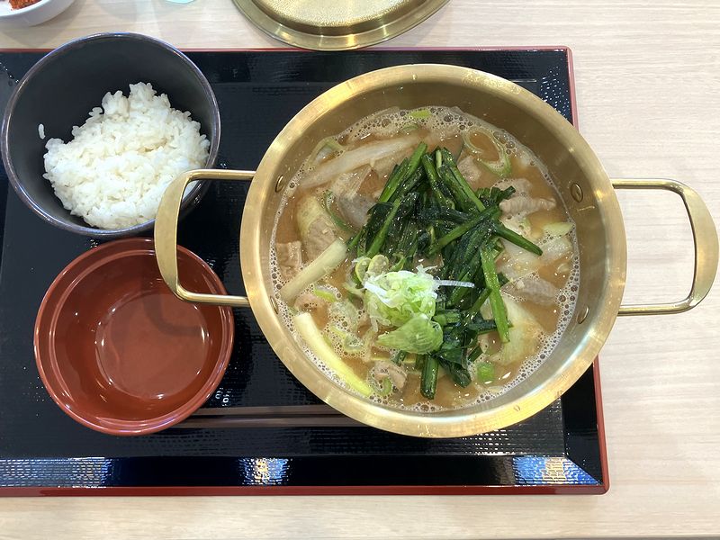 そこからあまり待たずに食券番号が呼ばれ取りに行きますが、そこでびっくり。もつ鍋よろしく、ちゃんとアルマイトの鍋(しかも、蓋付きで)に入ってるんですね。いや、メニューのポスターや券売機で食券買う時にも見ている筈なんですが、実際に見ると、かなりのインパクトだなぁ、と。