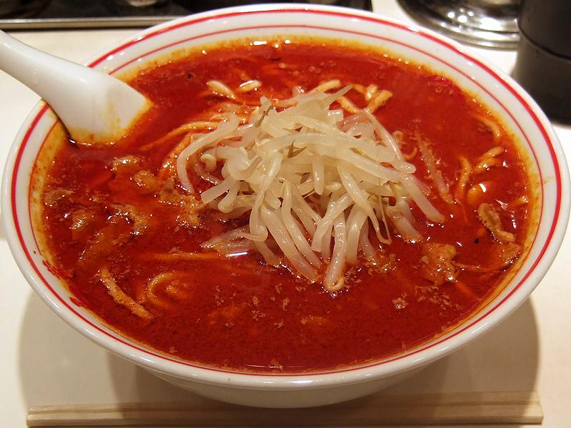 いざ実物を目の前にすると、その丼は想像以上の迫力というか、唐辛子で真っ赤なスープにはこれまた辛そうな真っ赤な油が大量に浮いていて、相当危険な感じが。意を決してスープを一口啜ると、「キター!!」もう、最初から、唐辛子全開!!!その奥に、複雑な旨味を感じる気がするのですが、正直、辛いというより、痛くて苦いです。あとは、むせないように注意しながら(でも何回かむせましたが…。)、デフォルトで大盛りの量だという麺と、口に入れるときは辛くて細長い物体だけど歯応えでそれとわかるモヤシ、芯まで辛みが染みたような豚肉を、ひたすら口に入れるのを繰り返しました。そして何とか麺と具は食べきったのですが、スープ完飲は断念。前回、冷やし味噌のハーフサイズを何とかいただいたので、今度も何とかなるだろうと甘い気持ちでいただいたのが、それは間違いだったというか…。スープにより暖まった麺とモヤシは、前回以上の凶悪さに感じられました。