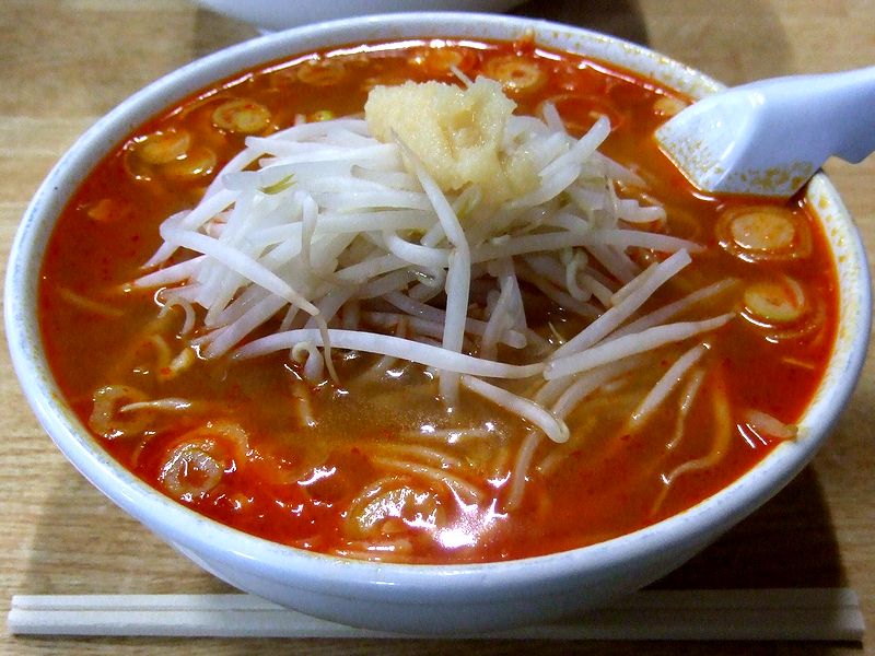 実は、こちらの味噌ラーメンをいただくのは15年ぶりくらいだったりするのですが、出されたラーメンは、モヤシの上に天盛りされた多めのおろしニンニクなど、おおむね記憶の中にあるのと同じ。ただ、記憶とはちょっと違うのが、丼の縁のまわりを彩る唐辛子の赤色で、これは当時は無かった気がしますが、昔のことなので、単なる勘違いかもしれませぬ。その味噌ラーメンを、まずは、出されたままの状態でスープを一口啜れば、ベースの鶏ガラスープがあっさりしている為、味噌と唐辛子の味と香りが結構主張します。次に、天盛りのおろしニンニクをよく混ぜ混ぜしていただくと、そのニンニクが、ベースのスープと味噌と唐辛子を上手くまとめ、更にそこに、ニンニク自体の風味が加わってパンチの効いた味になるような感じがしました。また麺は、手打ちのヌクヌクとした噛み応えがたまりませんが、スープがとてもパンチが効いているので、麺自体の小麦の味というより、スープと一体化した味を楽しむような感じになるような気が。そして具は、モヤシとネギのみ。モヤシの歯応えと瑞々しい味が、パンチの効いたスープの中で、いい息抜きになっていると思います。
