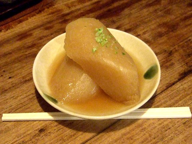 まず注文後に出していただけるサービスの突き出しは、前回同様、魚系の風味が効いた大根の煮物でした。これ、美味しいですよね。