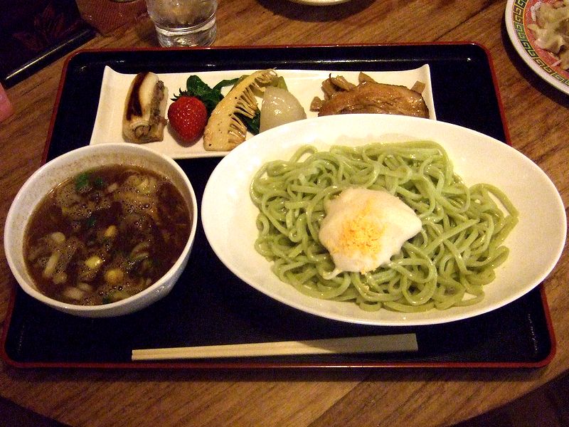 それでメインのつけ麺ですが、昨年のとの外観上の違いは、こちらのお店の農場で越冬した小松菜のペーストを練り込んだという緑色の麺と、季節の野菜を中心にした具というか付け合わせが別皿になったことでしょうか。で、まず、その緑色の麺に、麺の上に載った泡醤油をからめていただけば、ツルツルシコシコの食感と、ほのかに小松菜の清々しい風味が感じられるような気が。そして、味噌味の付け汁に浸けていただけば、今年の付け汁は、自家製味噌が結構主張して、とても力強い味に感じたのですが、私に似合わない表現をさせていただくのなら、「春の息吹の逞しさ」と言ったところですかね。付け合わせは日によって替わるらしいのですが、私がいただいたこの日は、写真左から、白ネギに餃子の餡の様なものを詰めて焼いた物、イチゴ、青菜(からし菜?)のお浸し、タケノコを薄味で焼いた物、カブを薄味で煮た物があしらってありました。イチゴ以外はどれも手を掛けて各々ちゃんと料理されたことを感じますねぇ。そしてこれは毎日共通であろうこちらのお店のラーメンにも入っているトロトロチャーシューとメンマです。あと最後は、店員さんに割スープをお願い。熱々のスープで割っていただけば、やっぱり、今年の付け汁は力強い感じがするなぁ、と、改めて思いました。