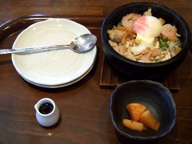 で、まず登場したのは石焼きチャーハン。焼けた石焼きビビンバの器に、ご飯、貝や海老、温泉卵などの具材に、大きなバターが一かけ載ってます。早速タレをかけスプーンでよく混ぜると、ほどなくしてパラパラのチャーハンが出来上がり、そして、所々には香ばしいお焦げが。いただいてみると、バターが上手く全体をまとめていて、何とも美味しかったです。