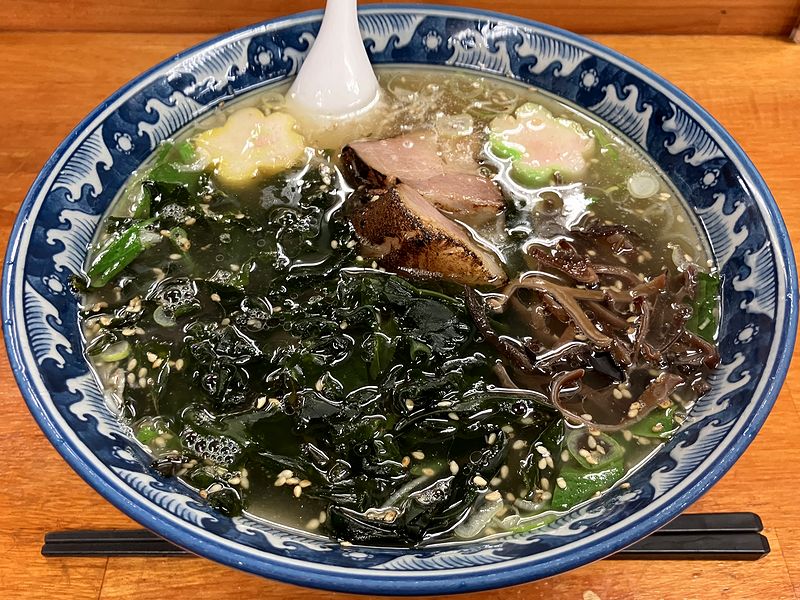 それで今回いただいたのが、こちらのお店のお品書き筆頭に書かれた塩そばなのですが、出された品を見て一瞬、「オレ、わかめラーメン頼んだって?」と。もっとも、ワカメは好きだし、ワカメが入ったラーメンも好きなので全く問題ないというか、むしろ嬉しいくらいなんですがね。あと、以前は味玉が半個入っていましたが、それがお麩2つに替わっていました。(たまたま?ただ、お品書きのトッピングからも消されていたのでメニュー落ちなんですかね。別料金でも良いからいただきたいんですが。こちらの固ゆでタイプの味玉、個人的には好きだったもので。)