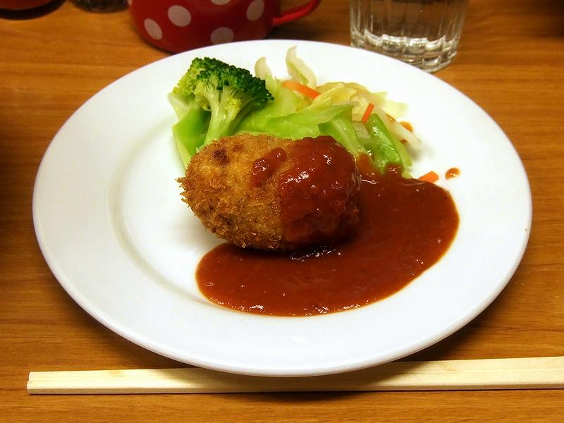 また、コロッケ小皿は、トマトソースの添えられたポテトコロッケに、茹で野菜(ブロッコリーとキャベツとニンジン)の付け合わせ。コロッケも、ソースもきちっとした洋食屋さんの味で、美味しゅうございました。