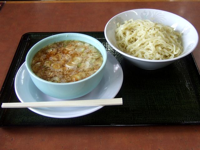 それから、味見させてもらった、こってりスープのつけ麺ですが、タレの味が濃いめのこってりスープに唐辛子とおかかを加えたような感じの付け汁に、締められてツルツル感の増した中太麺の組み合わせが、また。特に付け汁は、変に甘みは加えられておらず、また、酸味もほとんど感じられない、ある意味潔い感じの味で、結構好みかも。